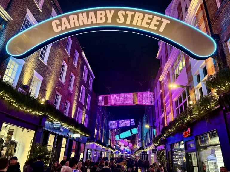 Carnaby is always a riot of colour and they usually go all out at Christmas; last year we have to say it was a little underwhelming, and the same lights are back for 2025.