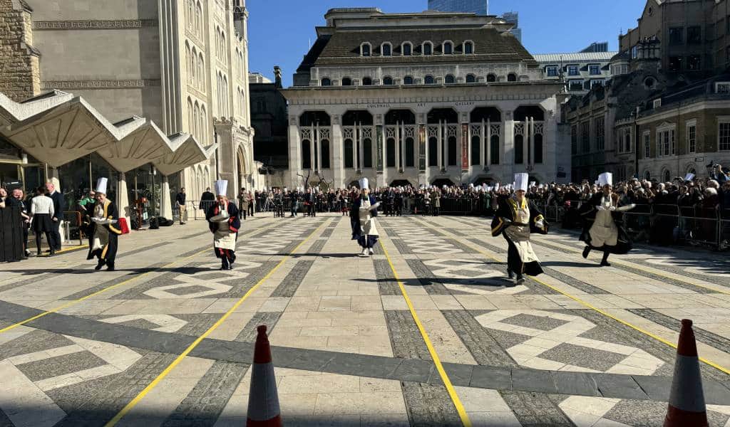 Crowds gather to watch the race for the crown in Guildhall Yard. Organised by the Poulters (egg suppliers), the event employs the skills of a variety of liveries: Clockmakers time it, Gunmakers fire the starting pistol, Glovers provide the white gloves worn by racers, the Fruiterers provide lemons and the Cutlers provide the forks!